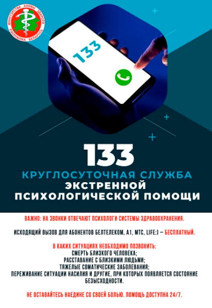 Бесплатный телефонный звонок по номеру 133 соединит абонента с Центром экстренной психологической помощи, созданном на базе РНПЦ психического здоровья. Горячая линия предназначена для тех, кто оказался в трудной жизненной ситуации и нуждается в профессиональной поддержке. Позвонив по номеру 133, человек сможет анонимно поговорить с психологом.