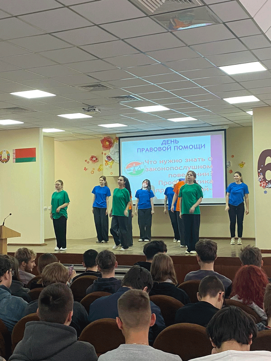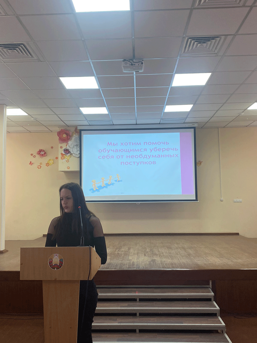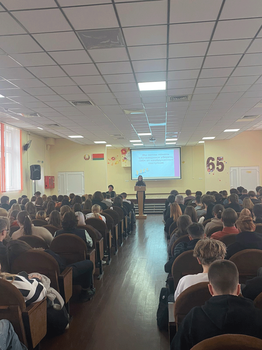 Старший инспектор КДН Барановичского горисполкома разъяснила обучающимся за какие противоправные деяния вызываются несовершеннолетние обучающиеся колледжей города Барановичи в сопровождении родителей на заседания комиссии. А именно, в сфере правонарушений против общественного порядка и нравственности (распитие алкогольных напитков или пива в общественных местах, либо за появление в общественном месте в состоянии опьянения), правонарушений против безопасности движения и эксплуатации транспорта, незаконного оборота наркотических средств и ПАВ, киберпреступлений, преступлений против собственности (мелкие хищения, кражи), а также преступлений против половой свободы или половой неприкосновенности.  Бугрова В.В. обратила внимание обучающихся на предупреждение экстремистских проявлений среди молодежи, на недопустимость участия во «флетах», «вписках» и т.п.