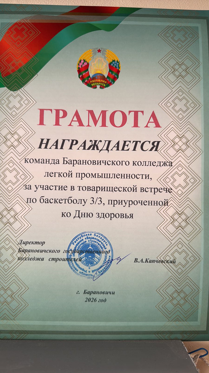 На минувшей неделе, в рамках реализации программы «Недели здоровья», сборная команда нашего колледжа посетила УО «Барановичский государственный колледж строителей». Целью визита стало проведение товарищеского матча по баскетболу между учащимися двух учреждений образования.